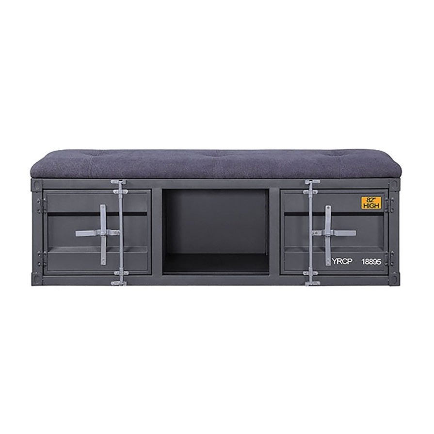 This modern industrial storage bench blends contemporary style with rugged elements, featuring a sleek design and a comfortable grey upholstered seat for entryways or living rooms. It includes one cabinet with two metal doors for ample storage and a middle open shelf for additional storage or display, enhanced by a full-length container lock for added security, perfect for keeping shoes, bags, and other items organized and secure.
