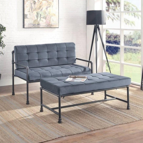 This furniture piece features a unique industrial-inspired design reminiscent of water pipes, adding a rustic and distinctive look, complemented by soft and stylish grey velvet upholstery for a sophisticated appearance. The button-tufted tight seat cushion and sleek metal legs provide a modern edge, while D20 density foam cushions ensure lasting comfort and durability.