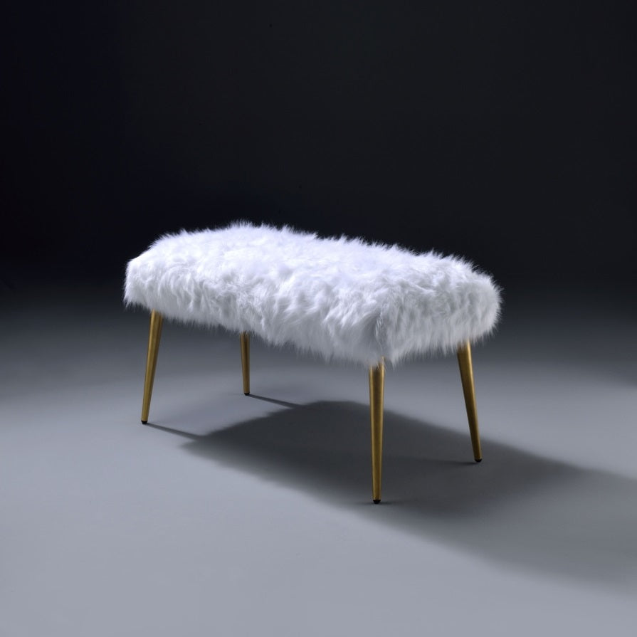 This sleek and contemporary bench features a white faux fur upholstered seat, offering a soft and cozy surface ideal for lounging. The faux fur not only adds texture and warmth but also contrasts beautifully with the gleaming gold metal legs, enhancing its glam and elegant appearance in any room.