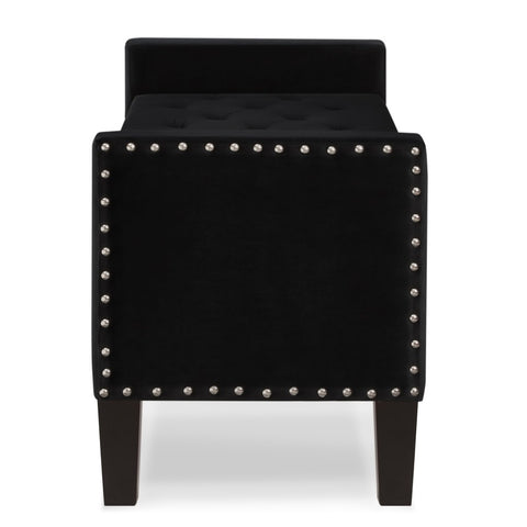 1. Spice up your interior with this stylish arm bench,perfect for adding accenting detail to any bedroom, living room, or entry area. Covered in soft velvet fabric, this upholstered bench has dark wood finished legs and a plush foam-padded seating area.The straight line frame design is bookended by nailed trim sides,adding an elegant touch to this piece. Use it to enhance the decor of any room of your home.