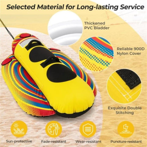 ● Enhanced Water Fun: This towable tube measures 73" x 40" x 23"(L x W x H) and comes with 2 deck seats, supporting up to 340 lbs, ideal 1-2 riders over 14 years old.  It is designed for thrilling water adventures across oceans, lakes, rivers, or pools.