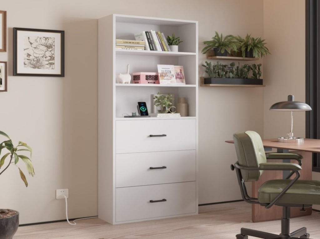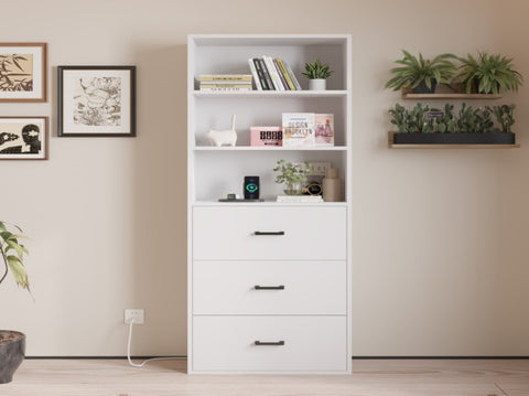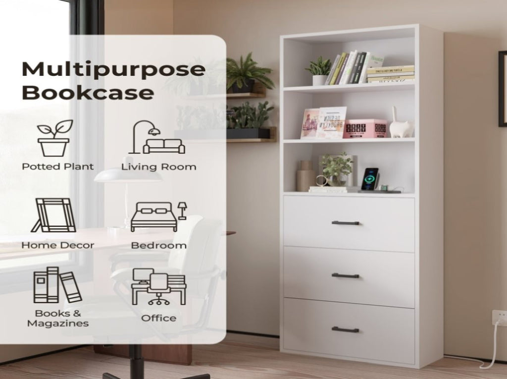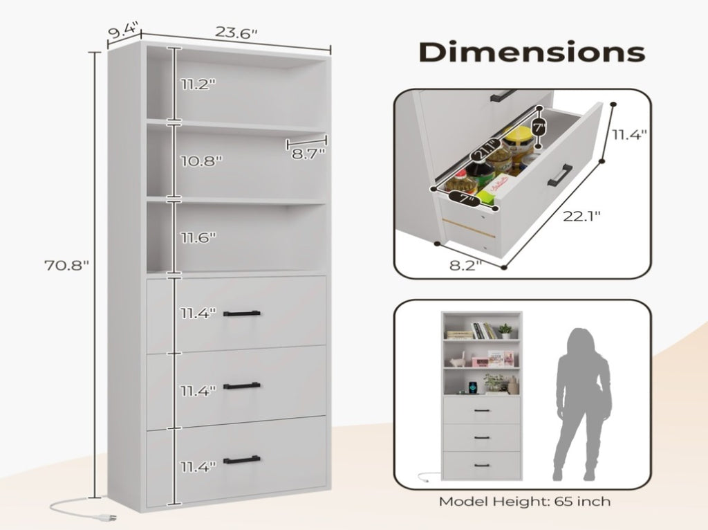 Stop piling books everywhere!The 70.8"high bookcase is a smart solution for storing and displaying your favorite books and exhibits.The display cabinet has 3 open shelves and 3 large drawers, providing ample space for storing sundries or decorations. We also have 2 AC sockets and 2 USB sockets, providing more possibilities for your use. Sturdy storage cabinets are made from high-quality engineered wood that won't wear or crack easily. The high bookshelf also has an anti-tip kit, which effectively prevents accidental tipping and makes it safer. The elegant design and simple style can match any home decoration style and are suitable for home and office use.