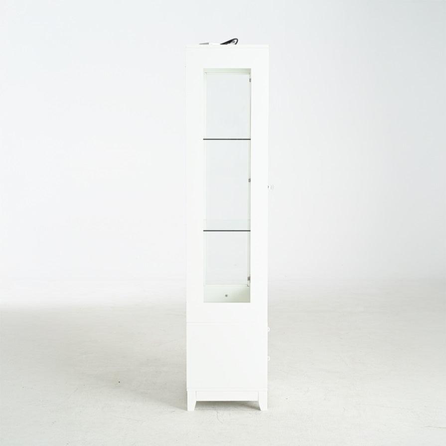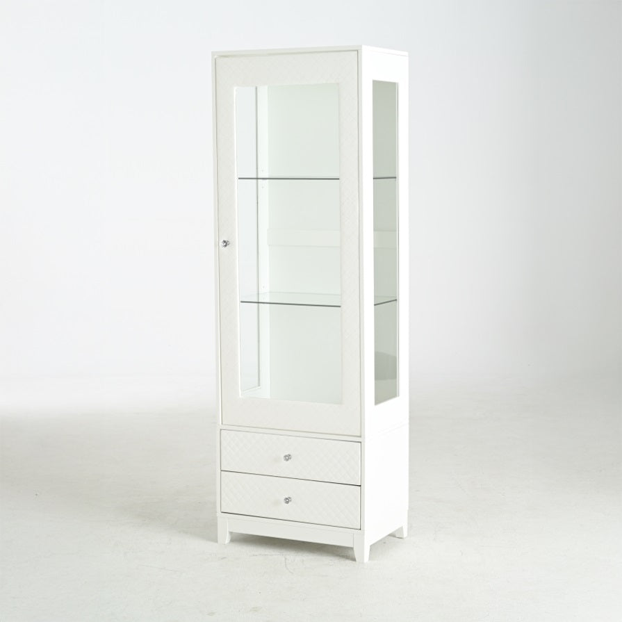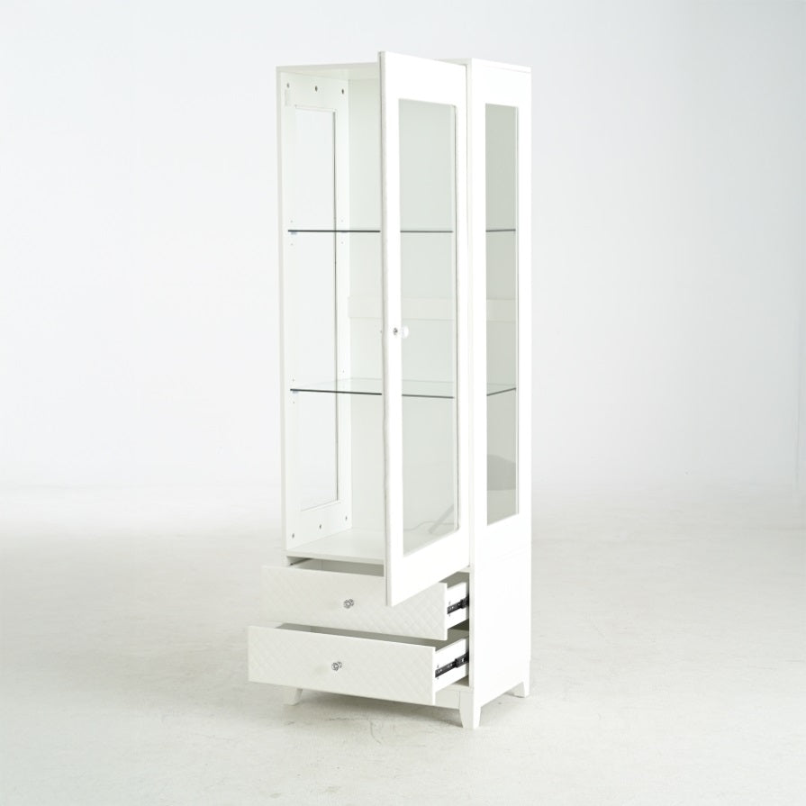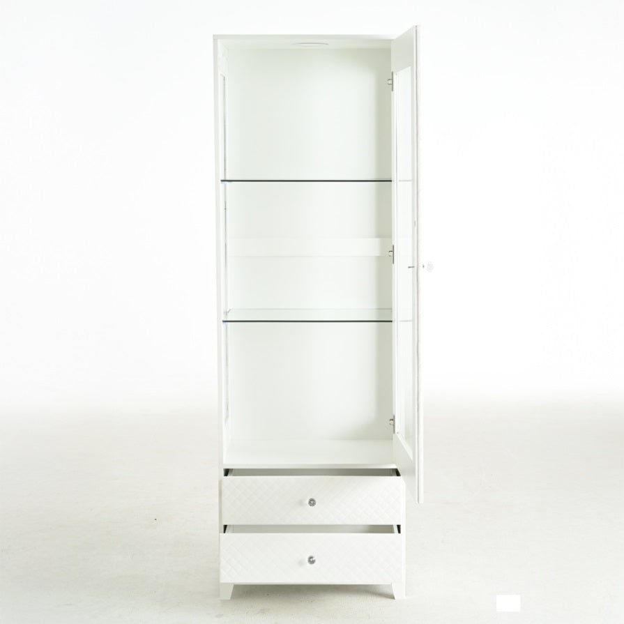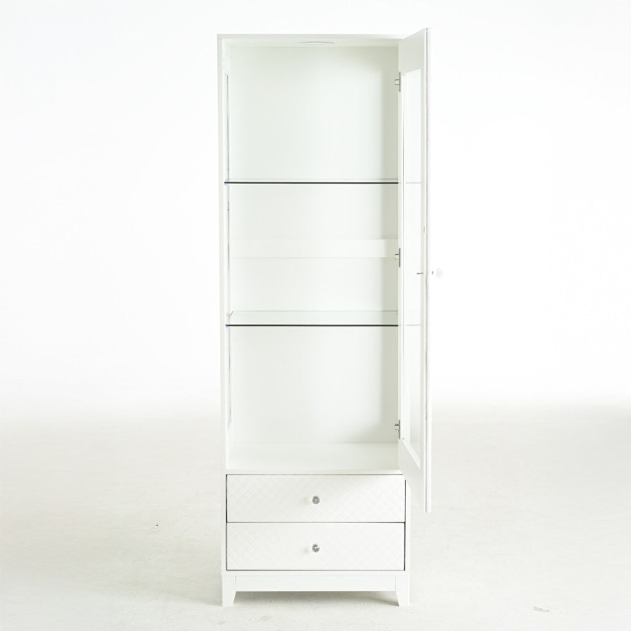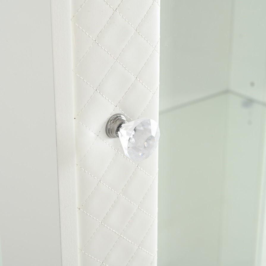 Upgraded Upholstered DoorThe display cabinet boasts an upholstered soft touch door, blending plush luxury with modern elegance. Its padded design exudes warmth and sophistication, creating a cozy yet contemporary aesthetic to complement any room's décor while adding a touch of refined comfort.