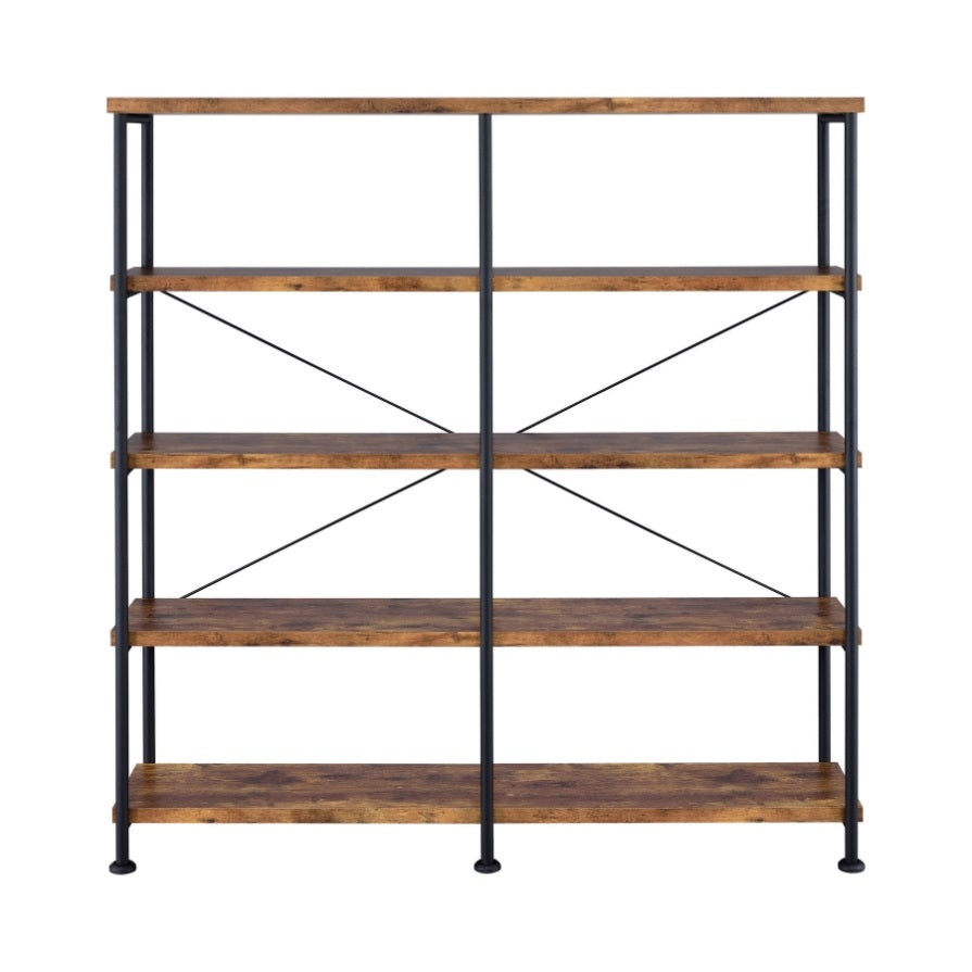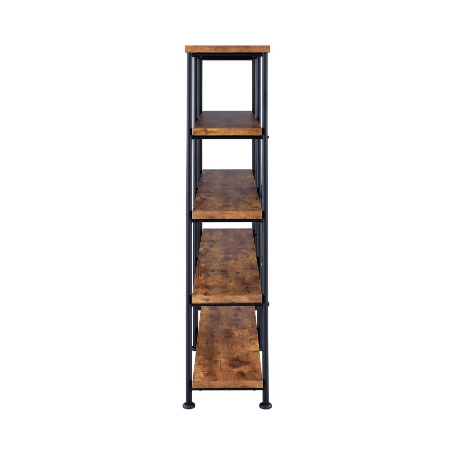 Display your favorite literature and decorative items in a unique fashion with this industrial double-wide bookcase. Heavy-duty metal pipe framing provides rigid support structure, and it contrasts this four-tiered bookshelf's antique finished wooden shelves, which are capable of holding up to 44 pounds each