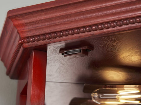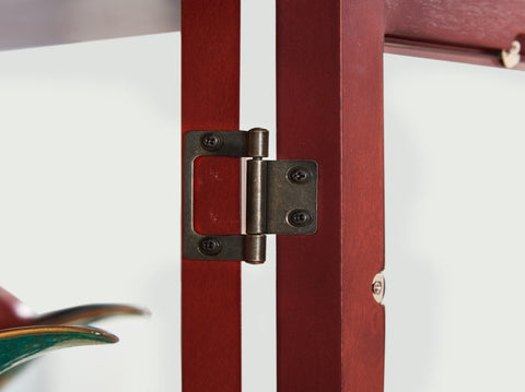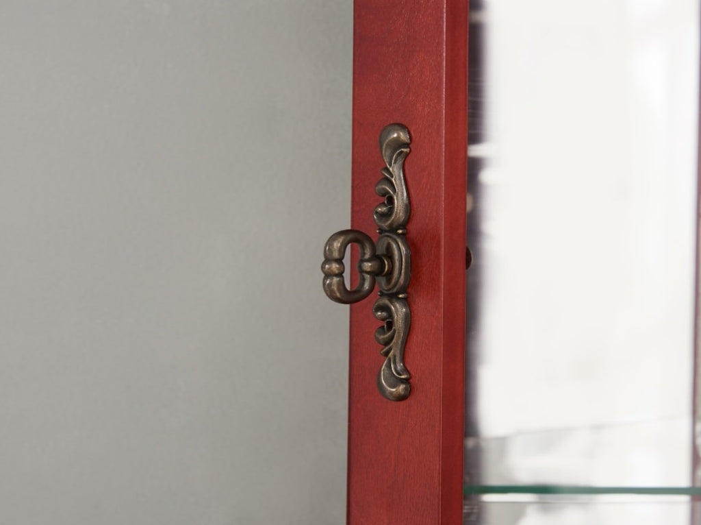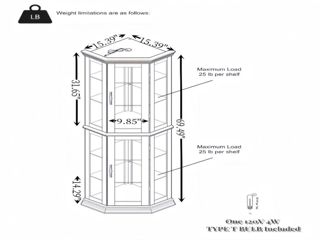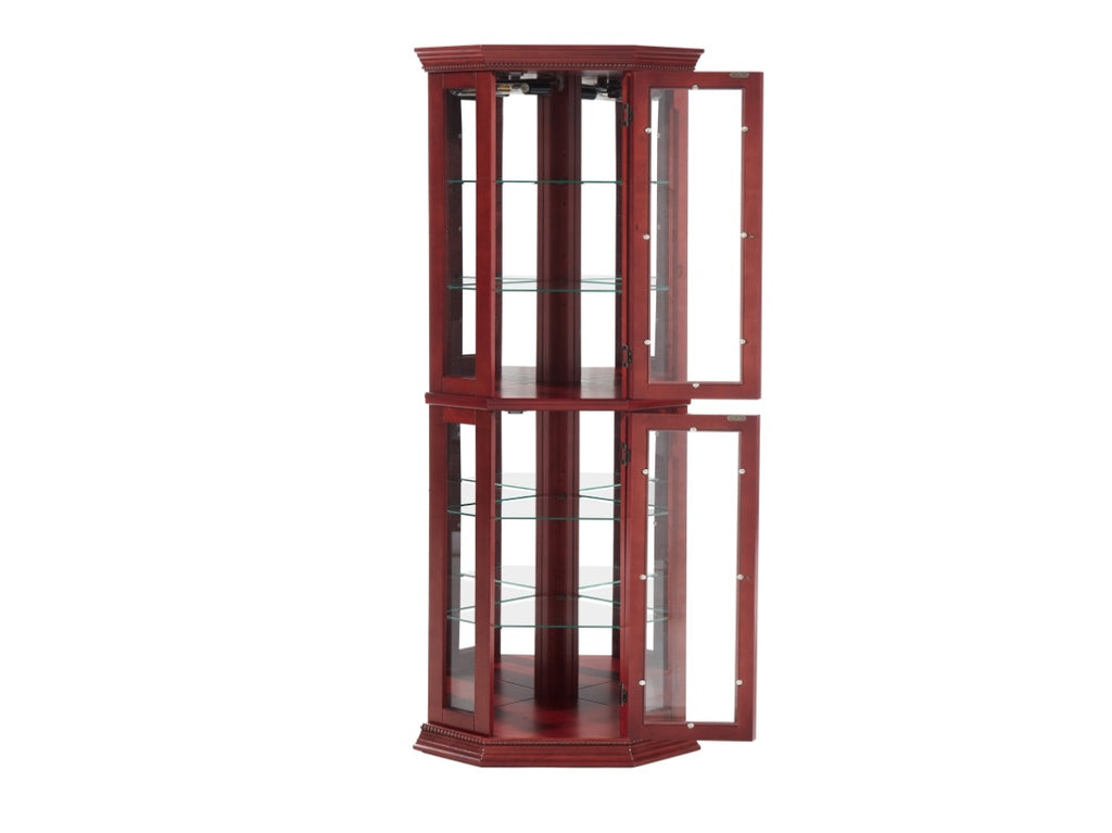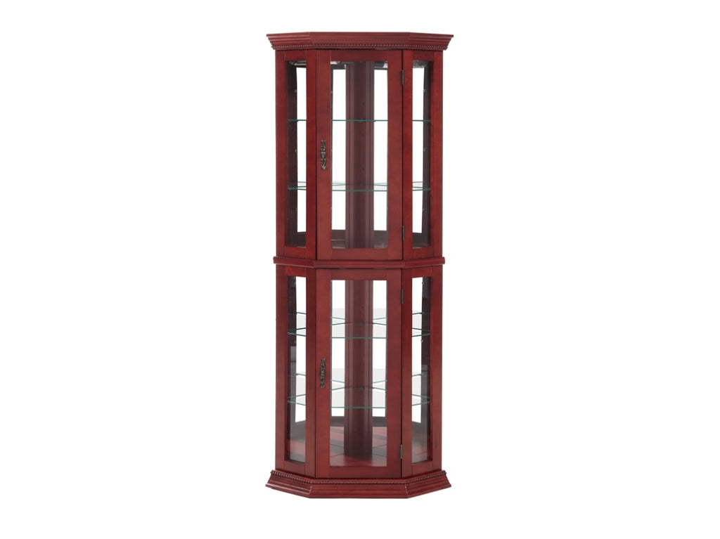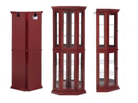 Available in Cherry or Oak, this exquisite cabinet with glass doors exudes a natural and sophisticated charm. Featuring two side-hung glass pane doors, this storage cabinet boasts six triangular corner shelves divided into two sections. The adjustable shelves can be tailored to your preferences, while the included light adds an extra touch of radiance to whatever treasures you choose to showcase inside.
