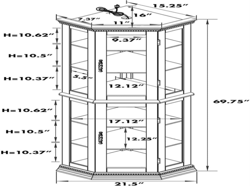 Adjustable Shelves:This lighted corner curio cabinet offers 2 fixed shelves and 4 tempered glass shelves, which is best for valuable or fragile items.The tempered glass shelves can also be removed if you would like to display taller items. Overall Dimensions: 69.75"H x 21.5"W x 16"D, Holds up to 150 lbs. Each of the shelves can hold up to 25 pounds of distributed weight.