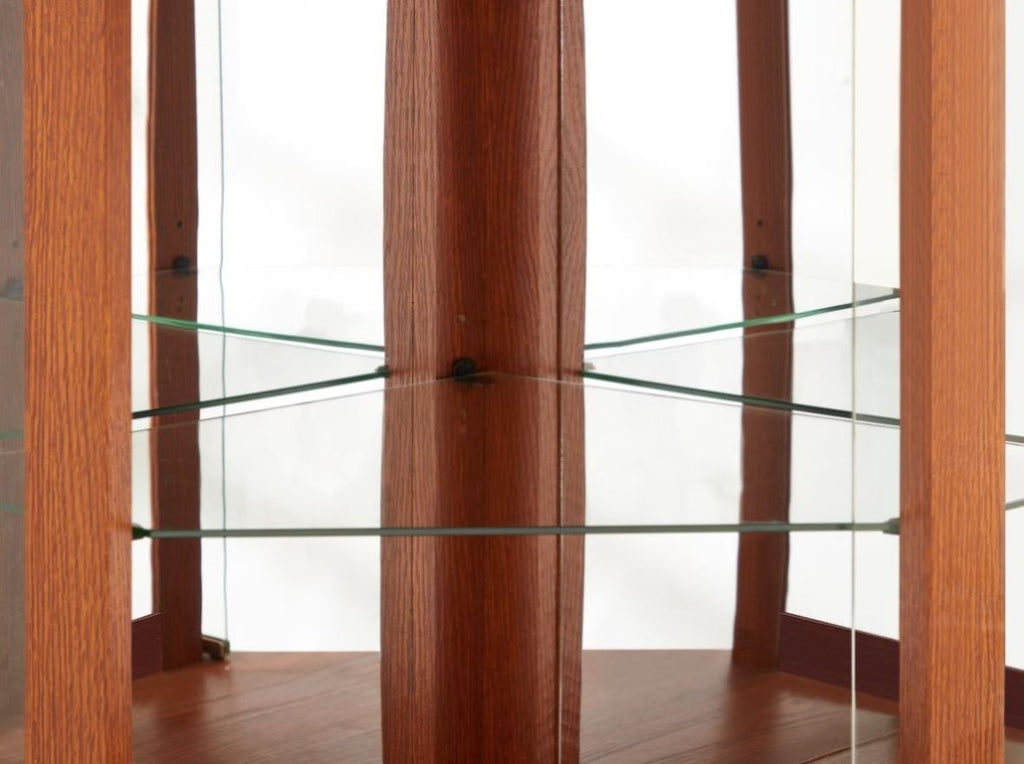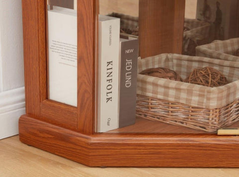 Presenting itself in a selection of Cherry or Oak, this cabinet adorned with glass doors boasts a gracefully curved and impeccably smooth silhouette. Its aesthetically pleasing design exudes an air of tranquility, imparting a soft and soothing touch to your interior decor while elegantly showcasing the items housed within.