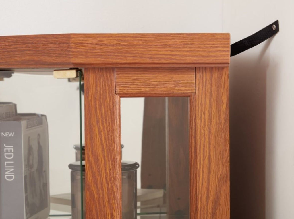 The back panel of the glass cabinet is designed with acrylic board. Please refer to the installation manual and remove the protective film from the back panel before installation.