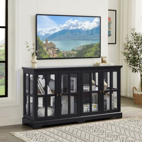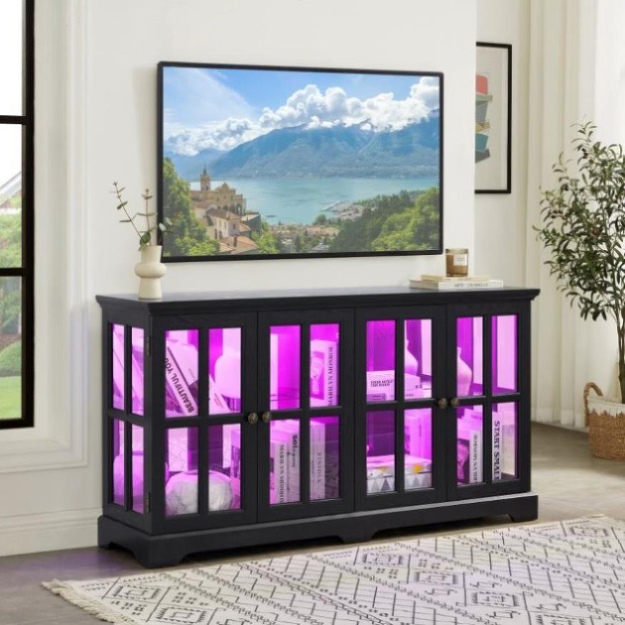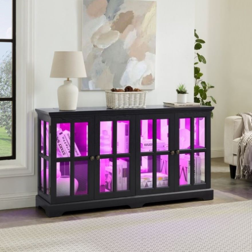 Elevate your home decor with our exquisite Antique BLACK Glass Cabinet. Crafted with a deep cherry finish, this elegant piece seamlessly blends classic charm with modern functionality. The stunning grid-style doors offer a glimpse into your cherished collectibles, while the adjustable glass shelves provide versatility for displaying items of various sizes. One of the standout features of this cabinet is the integrated 7-color LED lighting system, allowing you to customize the ambiance with just a touch of a button using the included remote control. Whether you're showcasing your prized antiques, using it as a stylish entertainment center for your television, or serving as a sophisticated dining sideboard, this cabinet adapts to your needs. Perfect for any space, this multifunctional antique glass cabinet serves as both a beautiful display case and a practical piece of furniture. Transform your home with a blend of elegance and utility