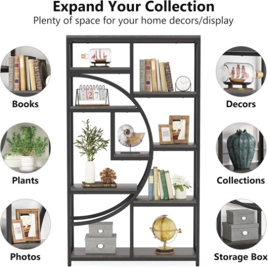 • Elegant Geometric Design: Crafted with a black metal frame and rustic gray board, this bookcase, with its half-moon silhouette design, brings sophisticated flair to your favorite aesthetic. Fill the bookshelf with books, photos, plants, and decorations to make it an eye-catching addition to your home