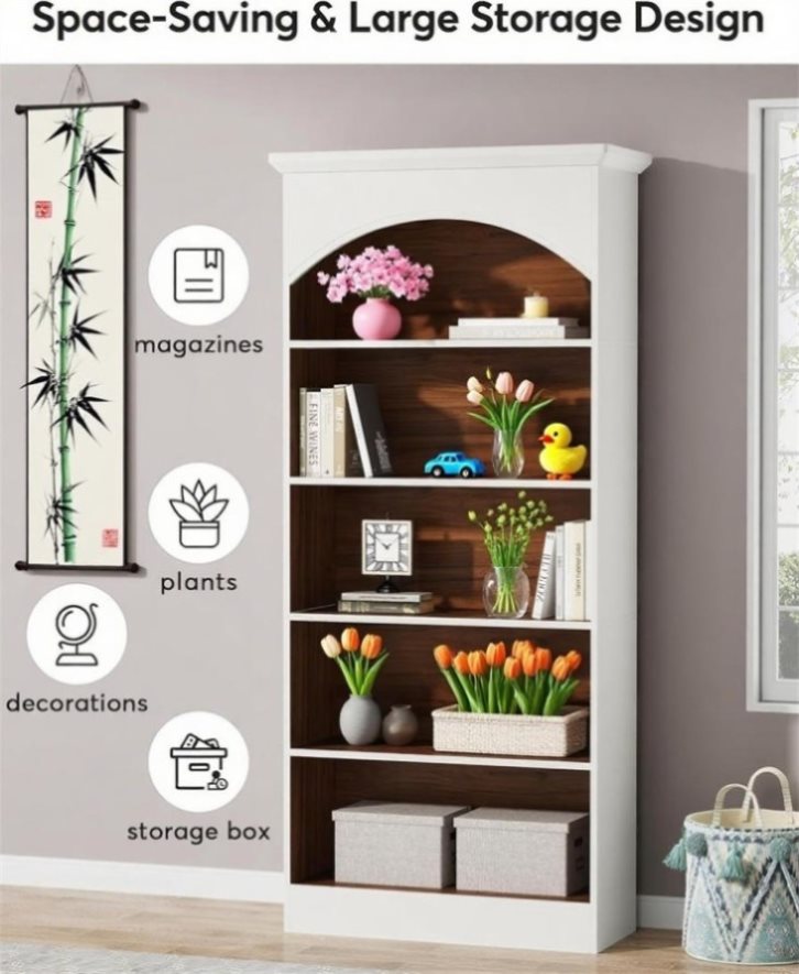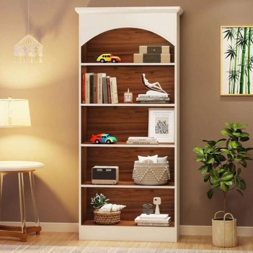【Full Wood Material】: Made of thick particleboard with a waterproof melamine finish, The design with white & oak color blend allows the wooden library bookcase to effortlessly blend into any decorating style. The full contact ground base design is firm and stable. Each shelf can load 35 lbs.