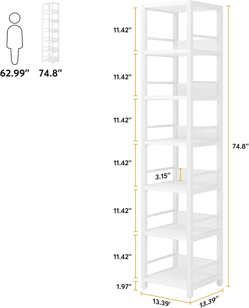 • SOLID & RELIABLE CONSTRUCTION: Crafted from thick solid E1 particleboard and sturdy metal frame, this narrow shelf tower is built to last, sturdy, water and scratch resistant. Adjustable leg pads added to help the standing shelf stand stably on uneven floor. Anti-tipping strap kits help prevent the skinny tall shelf from falling down.