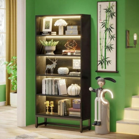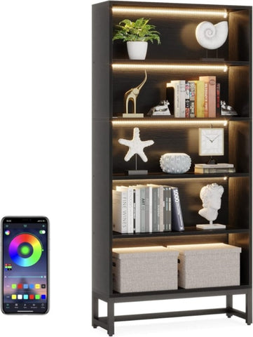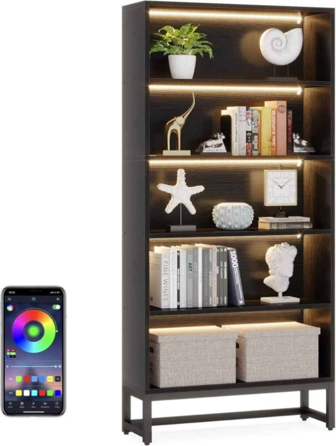 [5-Tier Bookcases with LED Litinging]: Each tier of our tall bookshelf is equipped with an APP-controlled LED light strip, which can be adjusted to any color and brightness you like. Item weight: 65.4lbs. Heavy and strong.