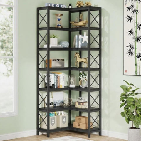 ✔ 【ADD VISUAL CHARISMA】 Steeped in rustic style, this corner shelf with matte black frame, X-bars blends functionality and self-expression together, working as a real enrichment for the lovers of industrial design furniture. This 7-shelf bookshelf is a great solution to add extra space for living room, bedroom and small apartment.