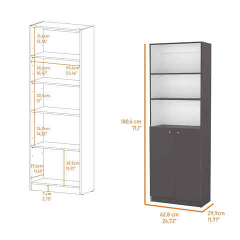 "The Sutton 2-Door Bookcase epitomizes the intersection of modern elegance and practicality. Boasting a unique double-door configuration, this unit reveals two finely crafted shelves, offering dimensions of 14.5""H x 15.1""H x 23.4""W x 11.6""D. This concealed space provides an uncluttered area for your cherished items. Above, the three open shelves, precisely measured at 12""H x 10.4""H x 23.4""W x 11.6""D, provide ample display space for your literature collection, decor, or keepsakes. With finish options spanning black, white, or matt/gray, the Sutton promises to be the centerpiece of any room it adorns. Dimensions: Height: 71,1"" Width: 24,7” Depth: 11,7“ Furniture Type: Ready to assemble (full assembly required).