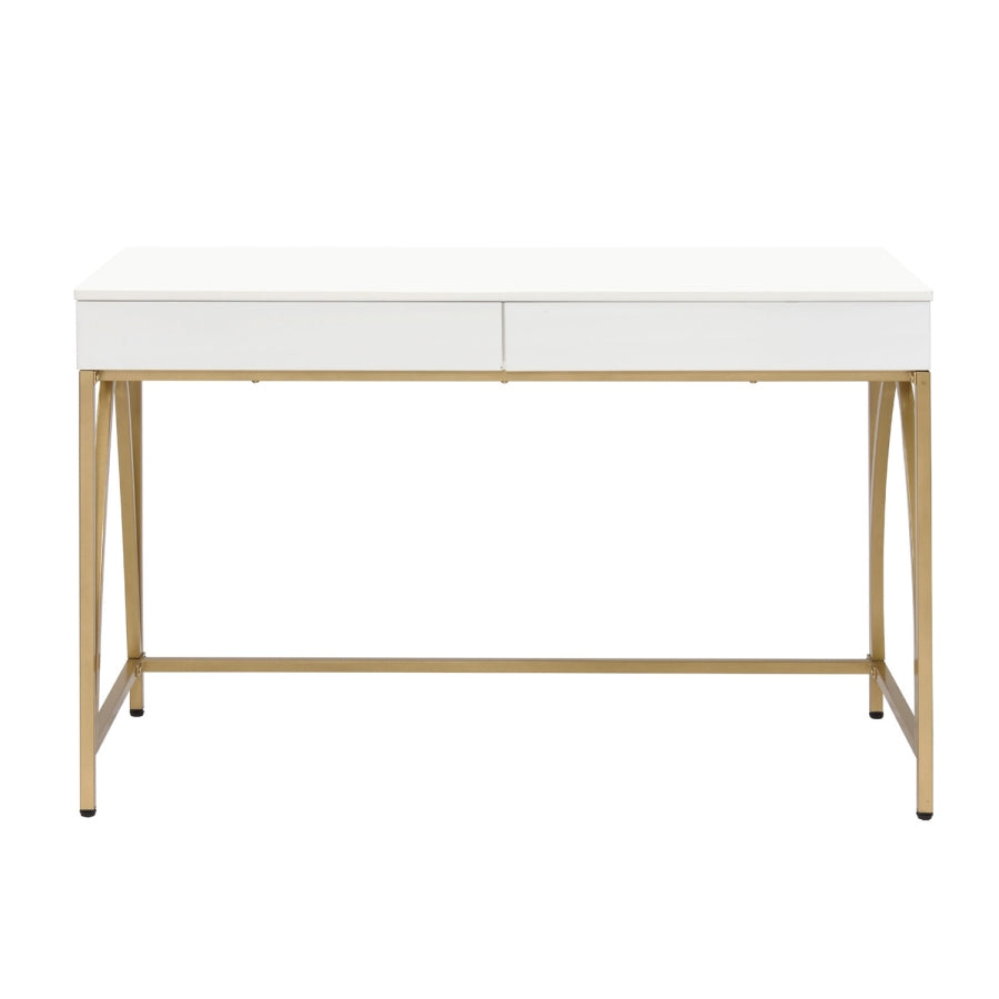 Create a space for your style with a desk like this, perfect for a glamorous touch in any room. This writing desk is crafted with selected wood in white high gloss finish top and metal straight legs in gold finish.Two drawers give you storage options for all your office essentials. It's perfectly proportioned to be added to a variety of spaces.