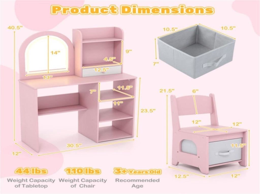 • Priority on Safety: Designed with kids' safety in mind, this makeup vanity desk set is equipped with an anti-tipping device to enhance the overall stability for your peace of mind. Plus, it also features rounded corners and edges, prioritizing safety to create a secure playing environment for your little ones.