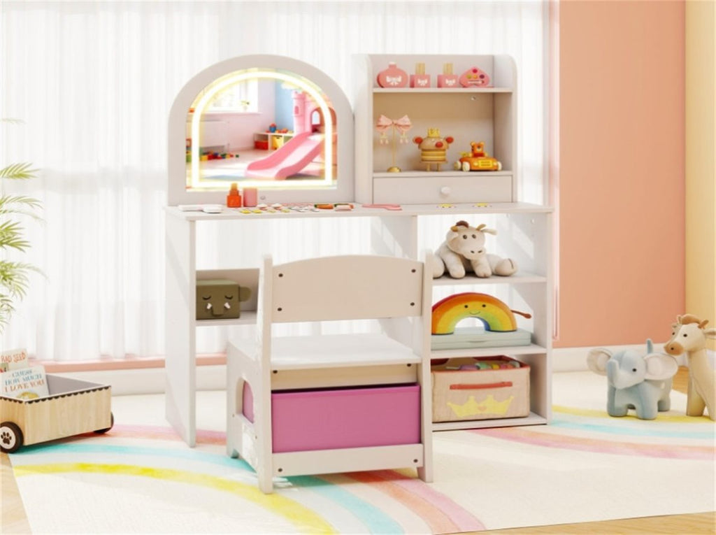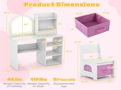 • Appealing Lighted Mirror: This kids' vanity desk includes a stylish LED-lit acrylic mirror that offers 3 color options (white light/natural light/yellow light), adjusted by simple press. This acrylic mirror is also shatterproof, ensuring safe use while enhancing the whole atmosphere with charming lights.