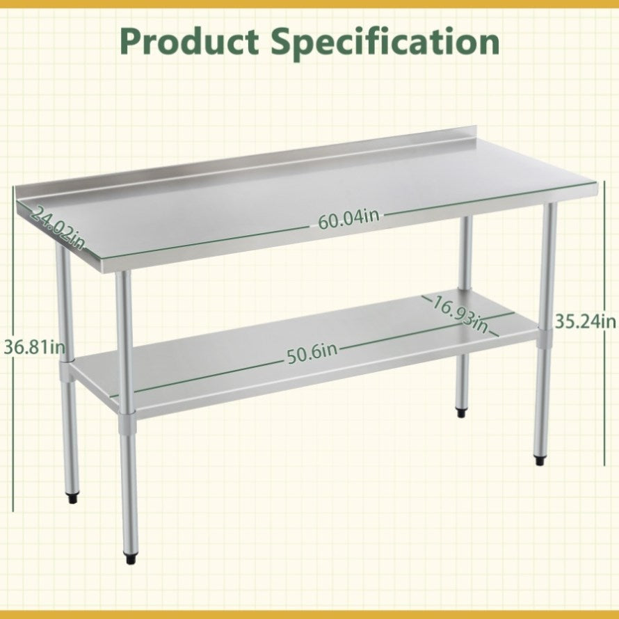 High Weight Capacity for Versatile UseMeasuring 24” x 60” x37”, this stainless steel table boasts a robust top shelf with a weight capacity of up to 560 lbs (or specify if different), and an undershelf capable of holding up to 460 lbs. Whether you're prepping food, storing equipment, or using it as a workbench, this table can handle the demands of any commercial or residential setting.