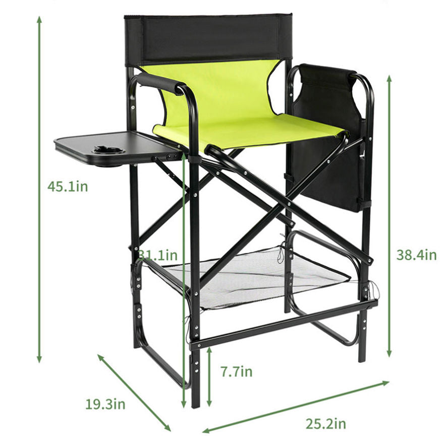 Experience superior comfort and functionality with this 31" Tall Directors Chair, designed for both outdoor adventures and professional use. Whether you're attending an outdoor concert, RV camping, or working as a makeup artist, this chair delivers convenience, comfort, and support. Featuring a spacious seat and a detachable footrest, it provides easy sitting and standing access, while its multifunctional side table, built-in cup holder, and storage pockets create the perfect mobile workstation. Built with a sturdy steel frame and durable 600D Oxford cloth, this chair supports up to 265lbs, offering a reliable and comfortable seating experience.