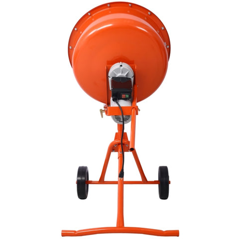 Color: Grey + Orange + Black combination, spray paint treatment Material: Steel plate Dimensions: 715X1240X1400MM Motor: 110~120V 60HZ 370W ; electromagnetic switch UL American three-prong plug, UL certified power cord, 50CM length Mixing bucket: 685X555MM; inner diameter 600MM, capacity: 130L; opening diameter: 370MM Tilt angle: 29 degrees; rotation angle 360 degrees; speed: 26RPM Mixing blade: 25X5MM Two solid rubber wheels: 10in