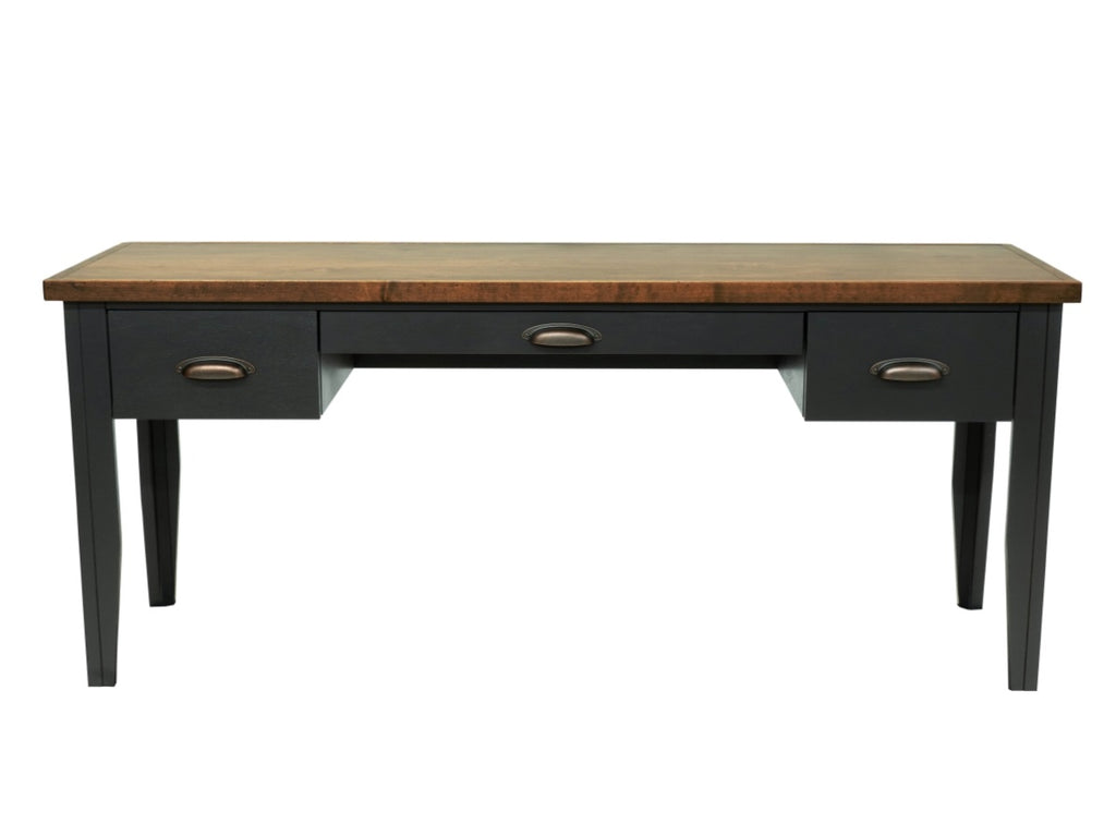 This 53 inch Writing Desk delivers a flawless combination of modern farmhouse style and country simplicity. Beautifully crafted from Poplar Solids, Okoume Veneers and Knotty Alder, this desk features a two-tone Black and Whiskey finish and oil-rubbed Bronze hardware. Ideal for your home office, great room or any creative space, this desk includes one drop-down keyboard drawer and two side drawers to keep your office essentials organized. Fully assembled upon arrival, this piece is ready to unbox and enjoy.