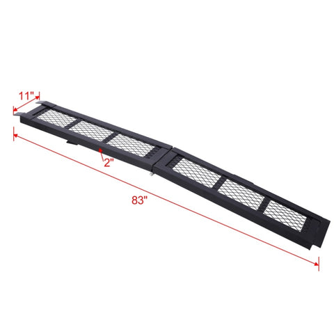 Robust Construction: This ATV ramp is constructed from heavy-duty steel material, ensuring durability and long-lasting performance. The black powder coated steel is resistant to breakage, rust, and scratches, providing a reliable solution for your loading needs. Unfolded Size: 83"x11" folded Size: 41.7"x13.5"x5.5“