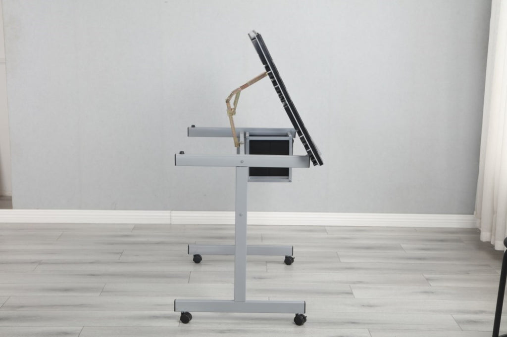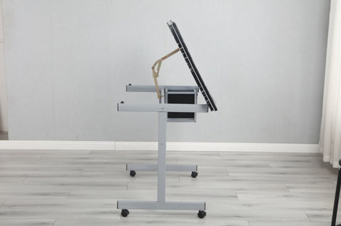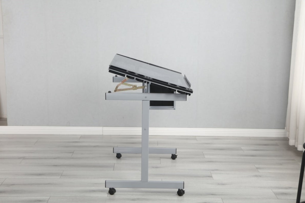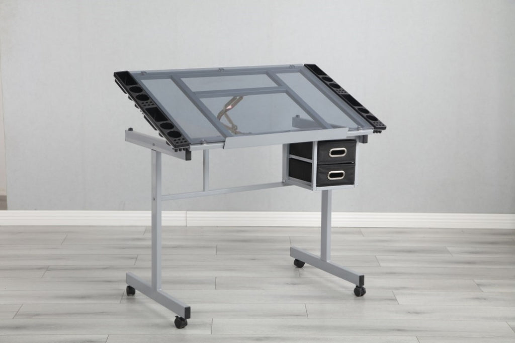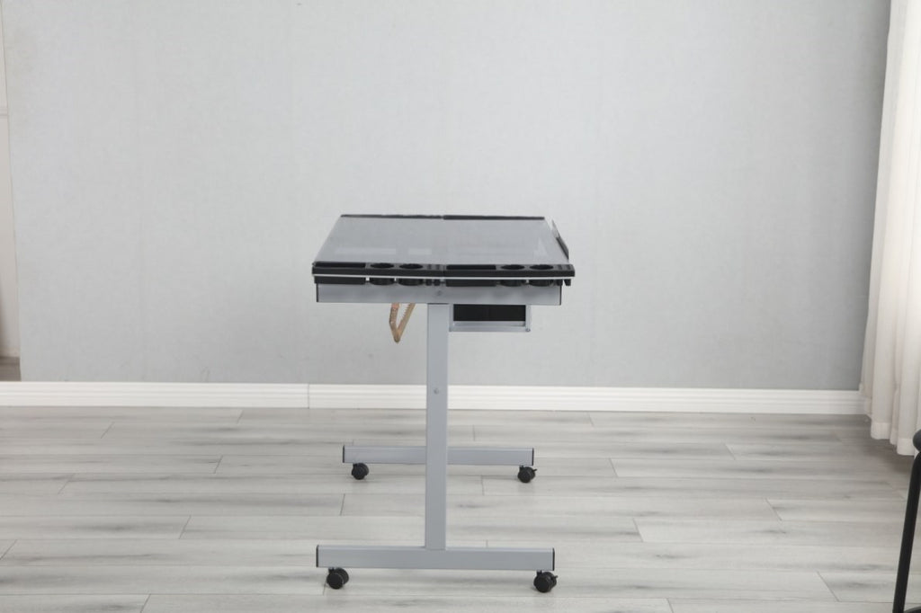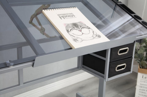 Storage space:This glass top drafting table desk features a host of compartments, trays and hanging drawers underneath for holding all of your paints, pens, and other equipment. If you accidentally spill ink and paint on the table, glass table top is easy to clean.