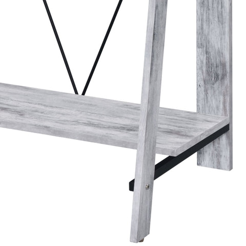 This rectangular writing desk offers ample workspace with both top and bottom shelves for convenient storage. The desk features a sleek metal V-shaped backing and sturdy 15mm thick panels, combining functionality with modern design.