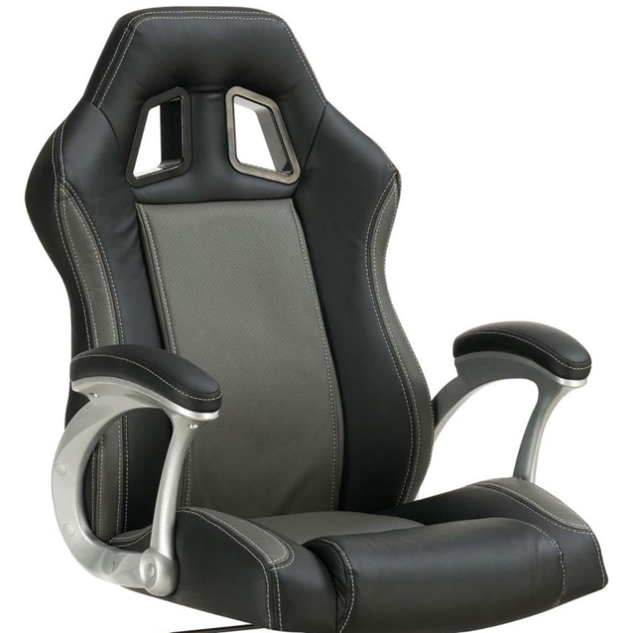Extra lumbar support means you'll be comfortable on those long work stretches. A sleek black polyurethane finish with contrast grey padding, chrome armrests and base and cutout details in the headrest makes this office chair a stylish necessity for your home office.
