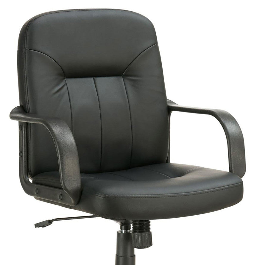 Adorned in black leatherette upholstery, the chair exudes classic elegance, blending seamlessly into various office decor themes while offering durability and sophistication
