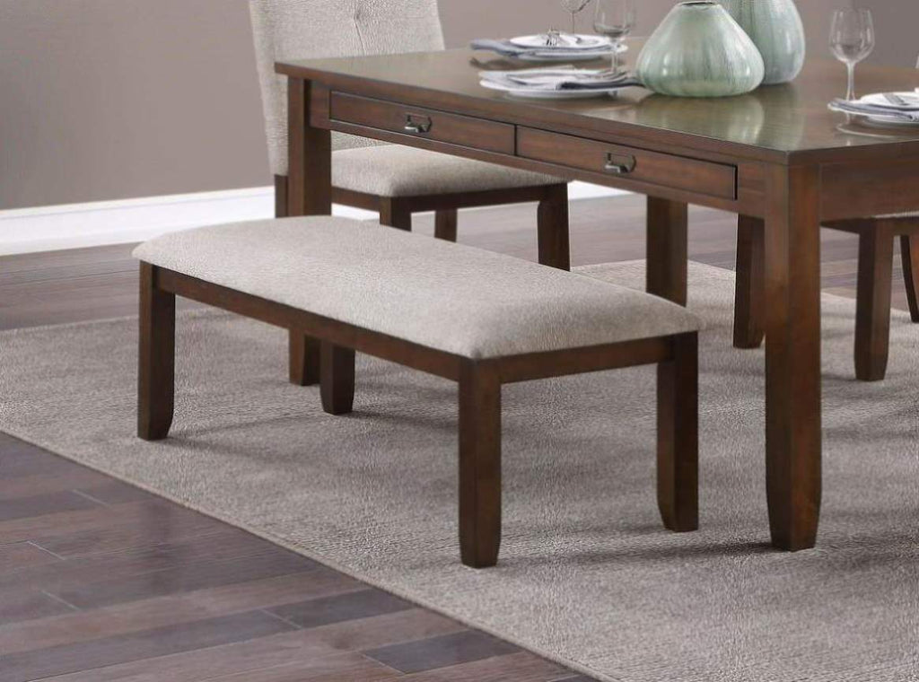 The clean lines of the Binghampton Collection allow for an unfettered accompaniment to your casual dining space. The neutral tone fabric seat presents complementing contrast to the cherry finish over cherry veneer of the bench’s frame.