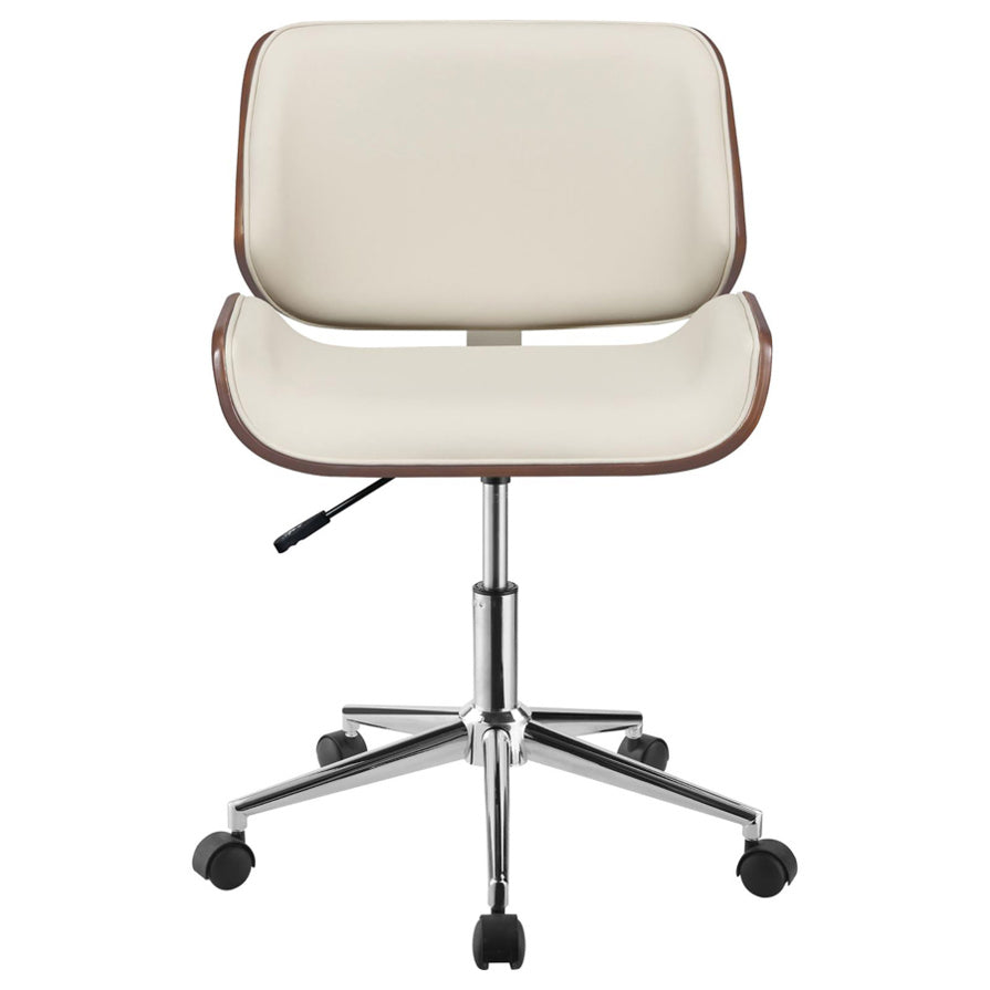 Featuring ecru leatherette upholstery, complemented by walnut and chrome trim, the chair boasts a luxurious palette, enhancing its visual appeal and adding a touch of opulence to any office space