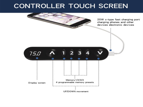 Latest Version Controller:The latest-generation controller features an LED display with 4 programmable memory buttons and a built-in side Type-C fast-charging port. Ditch extra power strips—charge devices directly on the desk, blending smart design with modern functionality.When obstacles are detected (accurately identified by the anti-collision system), the desk automatically lowers by 2cm/0.78in.