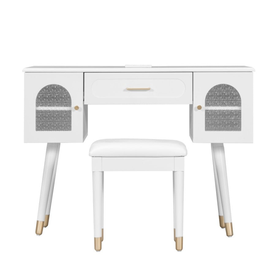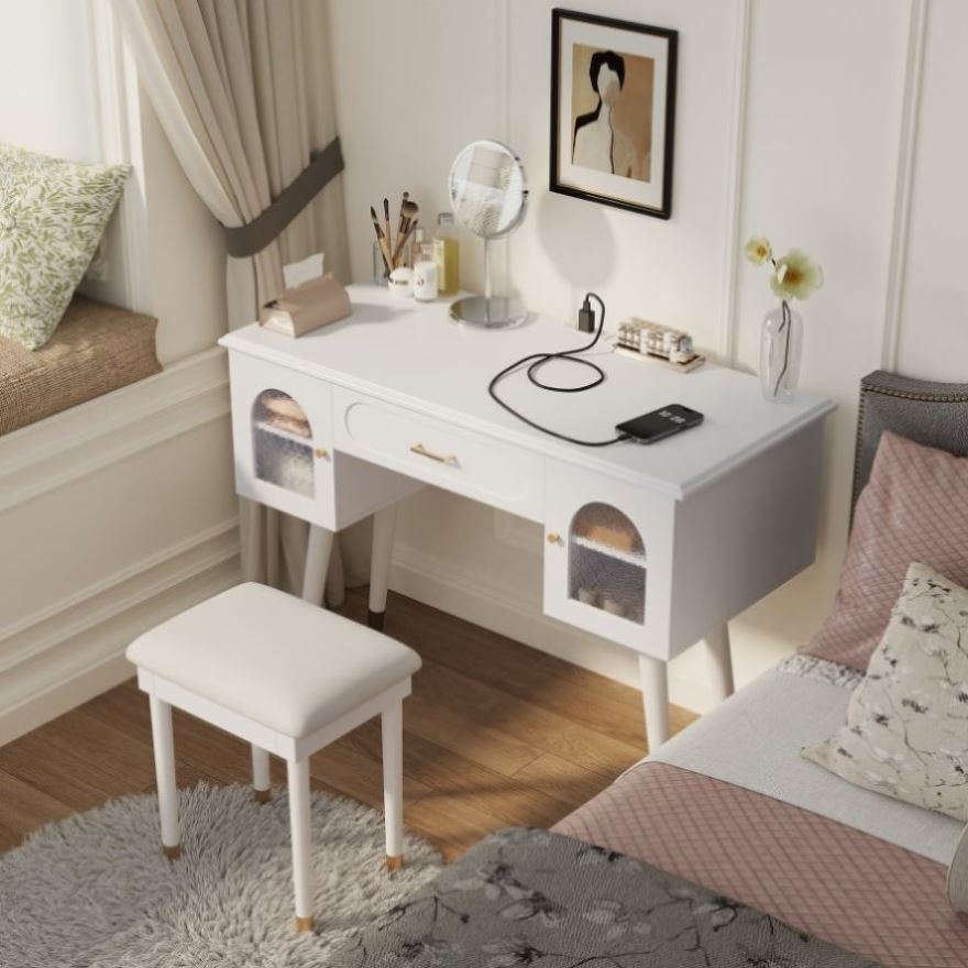 Versatile Design for Modern Living Experience the perfect blend of contemporary elegance and timeless charm with this chic vanity table. Designed for multi-purpose use, it seamlessly transitions from a makeup vanity to a writing desk or bedside table. Safety-focused rounded corners and a sleek design ensure it complements any room decor, while its compact size makes it ideal for small spaces. Whether in the bedroom, dressing room, or study, this versatile piece is a stylish addition to your hom