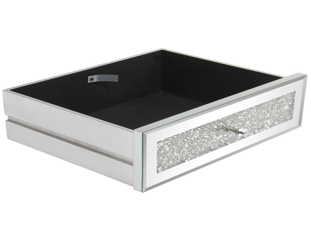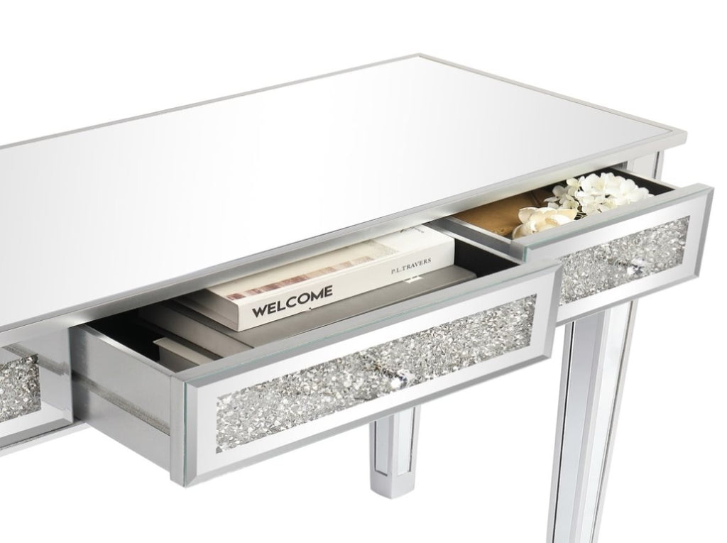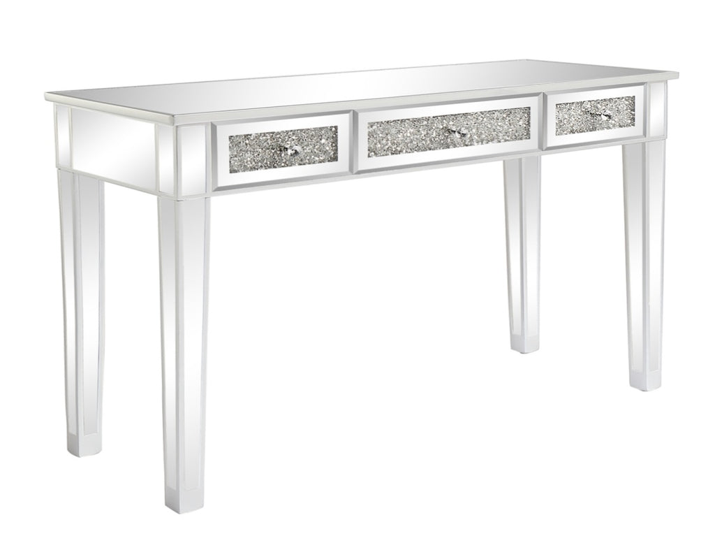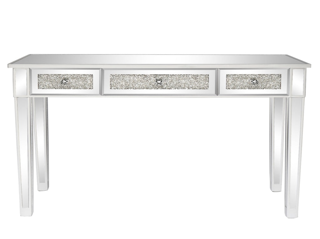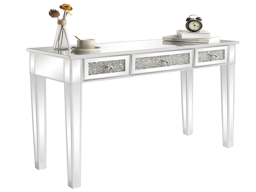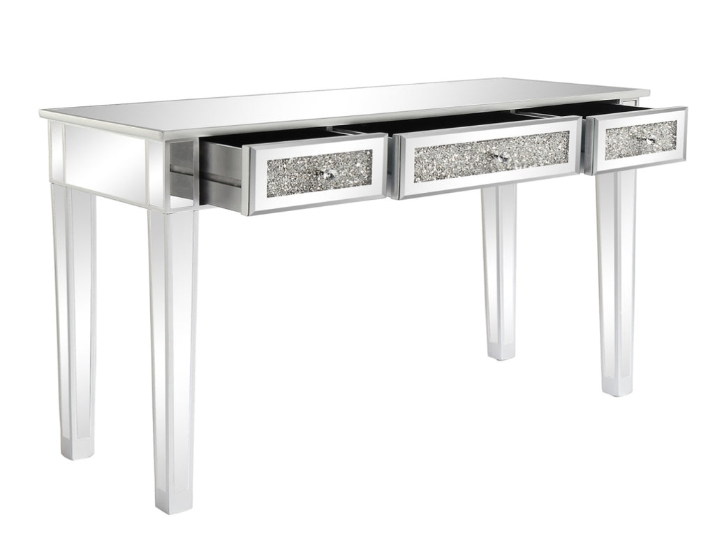 This is our Three Drawers Mirrored Table,Can be used as a Writting Desk, Dressing Table or Console Table, which has a beautiful appearance. It is perfect for any room, this mirrored makeup table will glamorously complement your home. With its mirrored finish, it adapts to any surroundings without overpowering yet, catches your eye with its unique presence. Shimmering mirror reflects across the composition. The practical size and function works as well in the living room as it does in the bedroom. Do not hesitate to buy one!