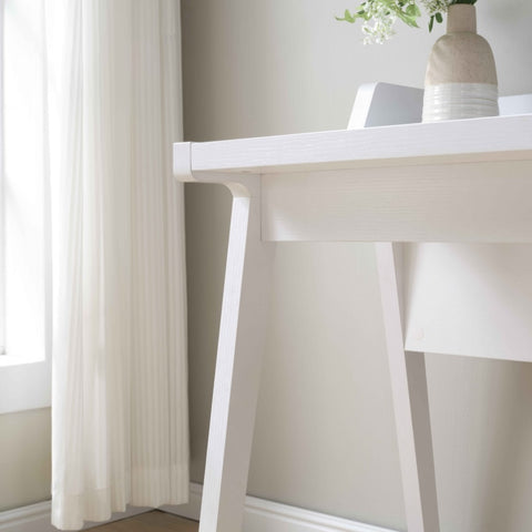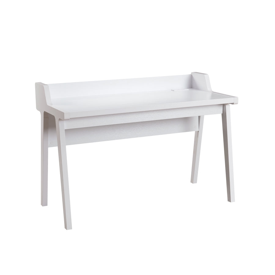 Upgrade your home office with this futuristic and modern desk featuring a wrap around top carrier to prevent items from falling off. Flared sturdy leg posts and modesty panel keep the desk stable and stylish. Desk is finished on the back and so can be floated in the room.