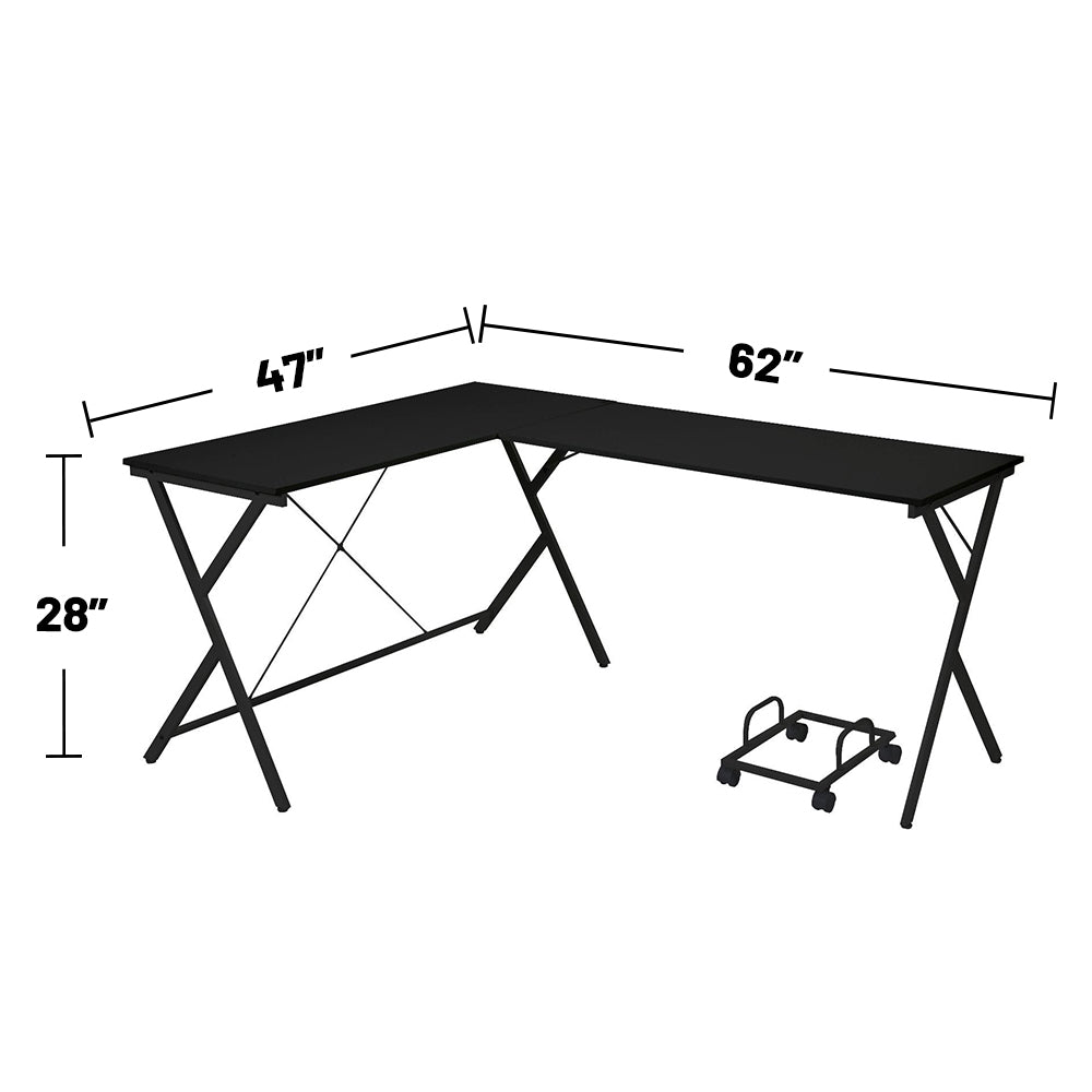 Bring clean lines and modern style into your space with this computer desk. This corner computer desk features a sleek, clean metal frame that exudes modern elegance and simplicity. "L" shape design provides a spacious surface area while attached computer holder with four wheels adds extra function. Make the most of your workspace with this versatile desk that makes everything feel more modern and complete.