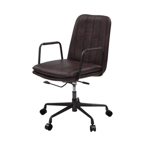This swivel office chair features a 360-degree swivel, allowing for easy movement around the workspace. The seat height is adjustable to accommodate different users and working styles, and the chair comes equipped with wheels for easy mobility and maneuverability, with top grain leather upholstery providing a premium feel and durability.