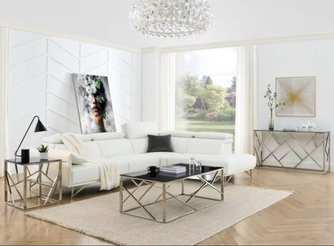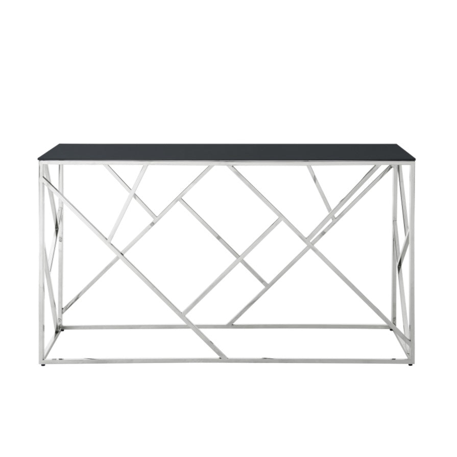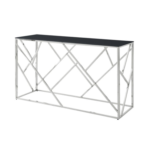Modern Console Table: Narrow Console Table with chrome finished metal frame and black tempered glass top. Striking modern style accent sofa table.
