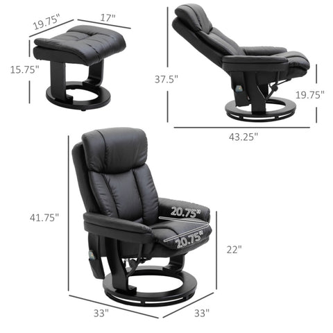 - Color: Black - Material: Steel Frame, Wooden Legs, PU, Foam - Sofa Dimensions: 30.75" W x 34.25" D x 40.25" H - Ottoman Dimensions: 17" W x 17" D x 16.5" H - Armrest to Floor: 22" - Seat Dimensions: 20.75" W x 20.75" D x 19.75" - Input Voltage: 110-240 V / 50-60 Hz - Weight Capacity: 352 lbs. (sofa), 44 lbs. (footrest) - 1 x Massage Sofa with Ottoman Set - 1 x Manual