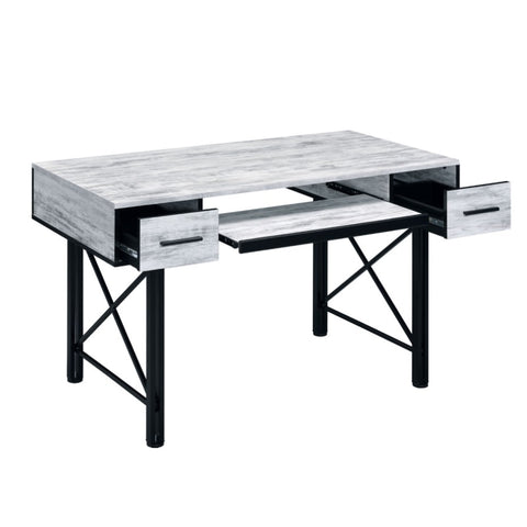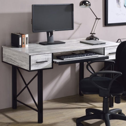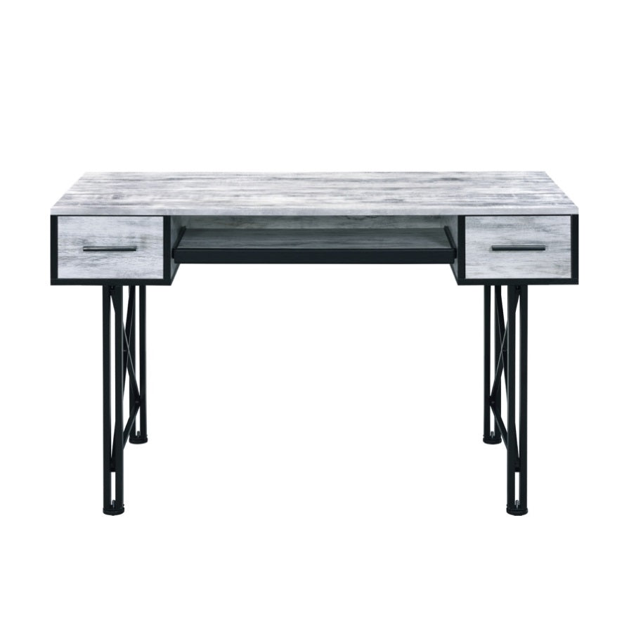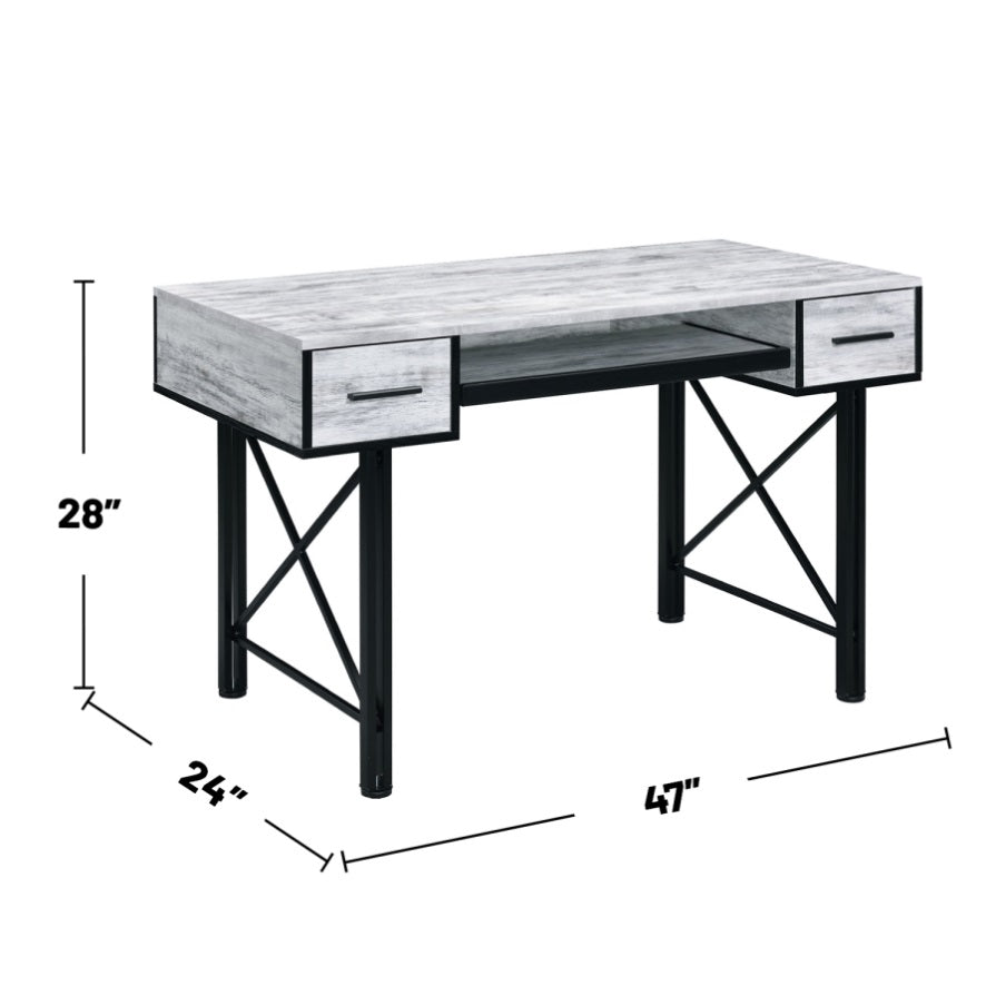 The desk bring a mix-and-match look with distressed casegood and black metal frame. Found atop a double pedestal base, It is accented with metal trim and "X" shaped support for industrial details.Two drawers on both sides help you clean the table top, and a keyboard tray under the top is perfect for a PC user.