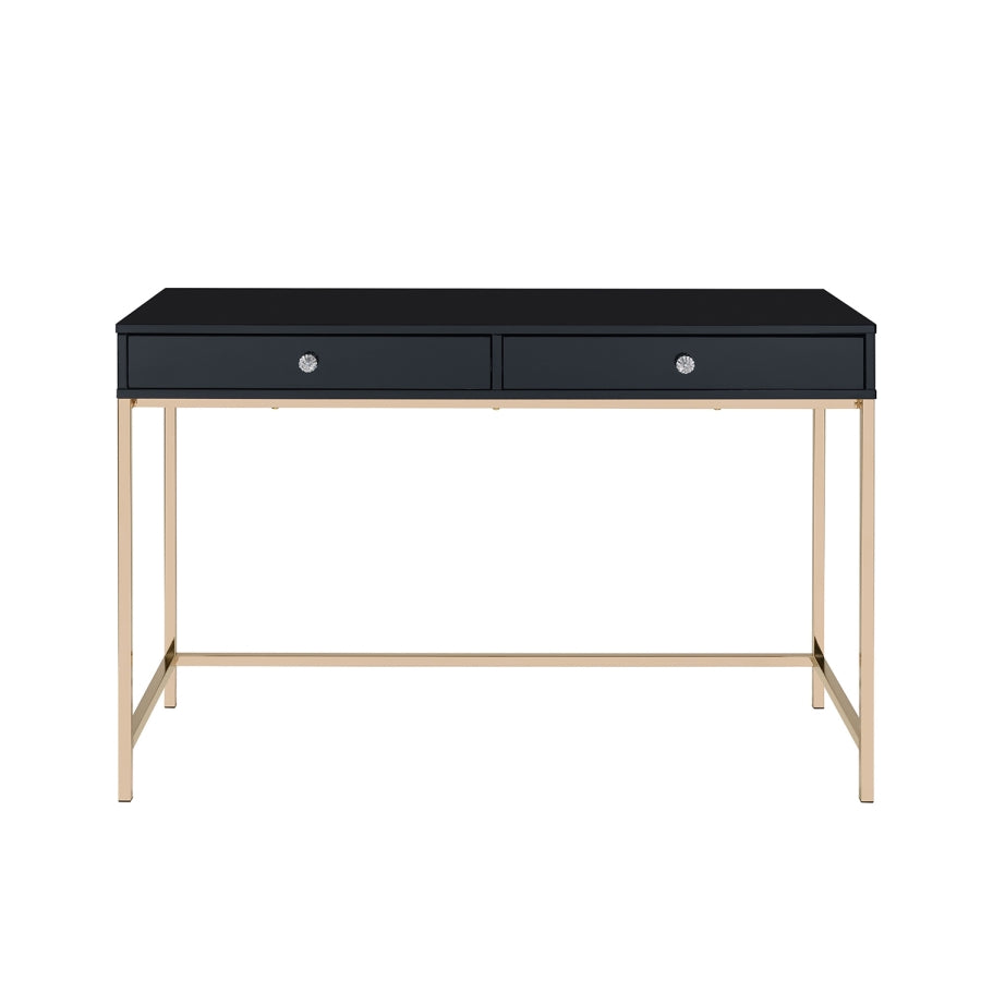 Motivation starts with a great office or study space. Enjoy the contemporary design of this office desk while getting all of your work done in style. Featuring a black high gloss finish with a gold metal base, this practical yet fashionable desk offers ample surface room and two storage drawers for your office supplies or other accessories. Perfect for any office space in your home, this office desk will offer excellent space to organize all your work and study needs.
