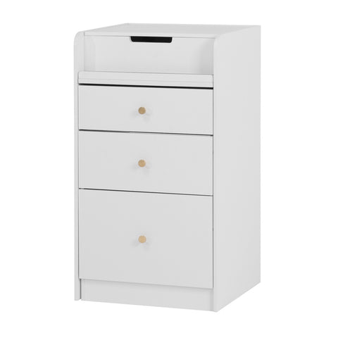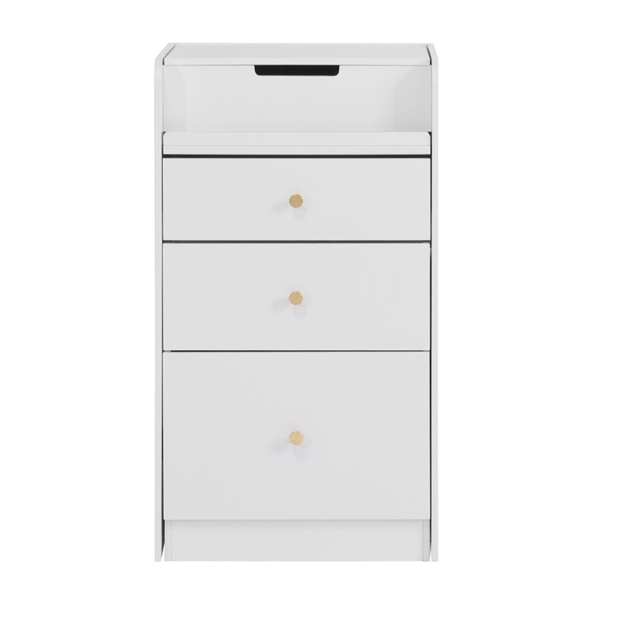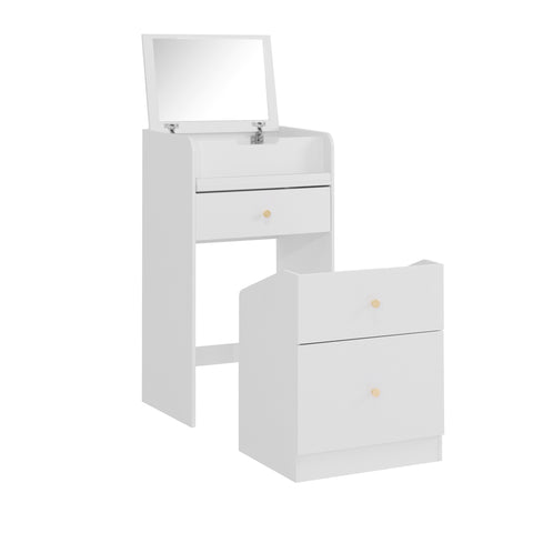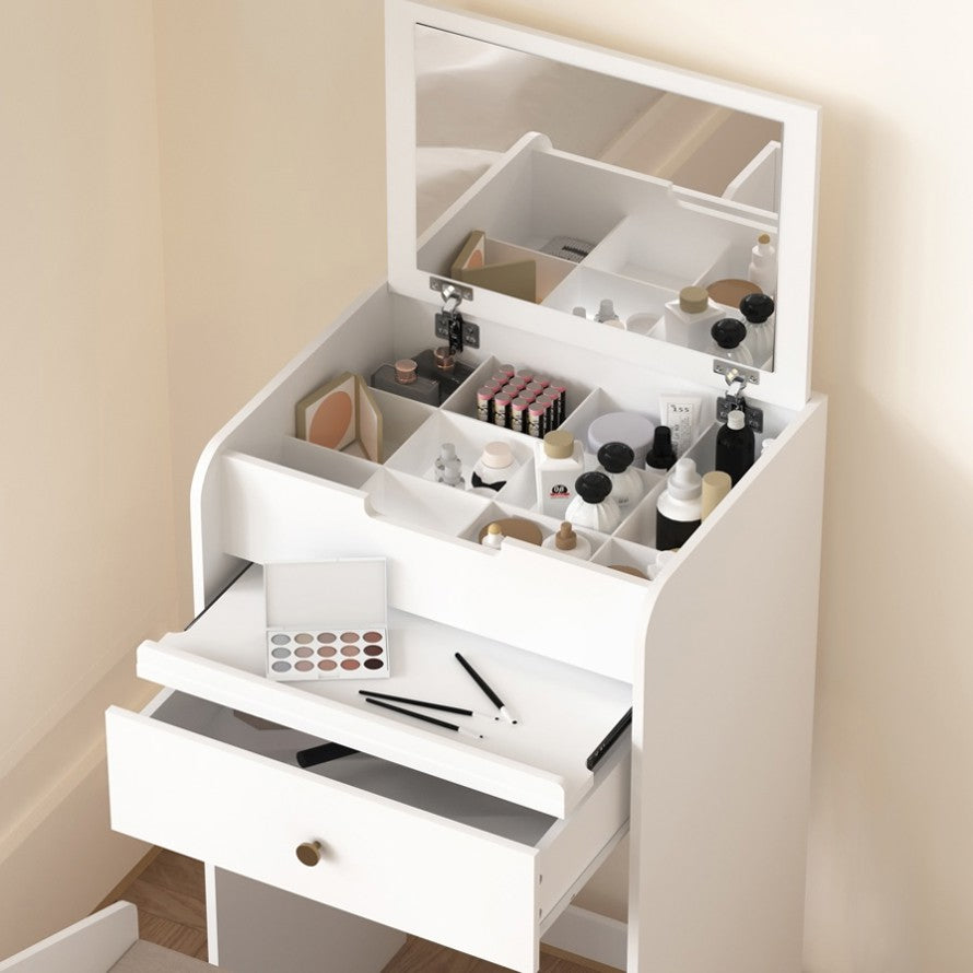 A telescreens table for hands, a mirror on top, multiple storage compartments to keep things organized, and two drawers at the bottom that can be stored or pulled out to serve as stools