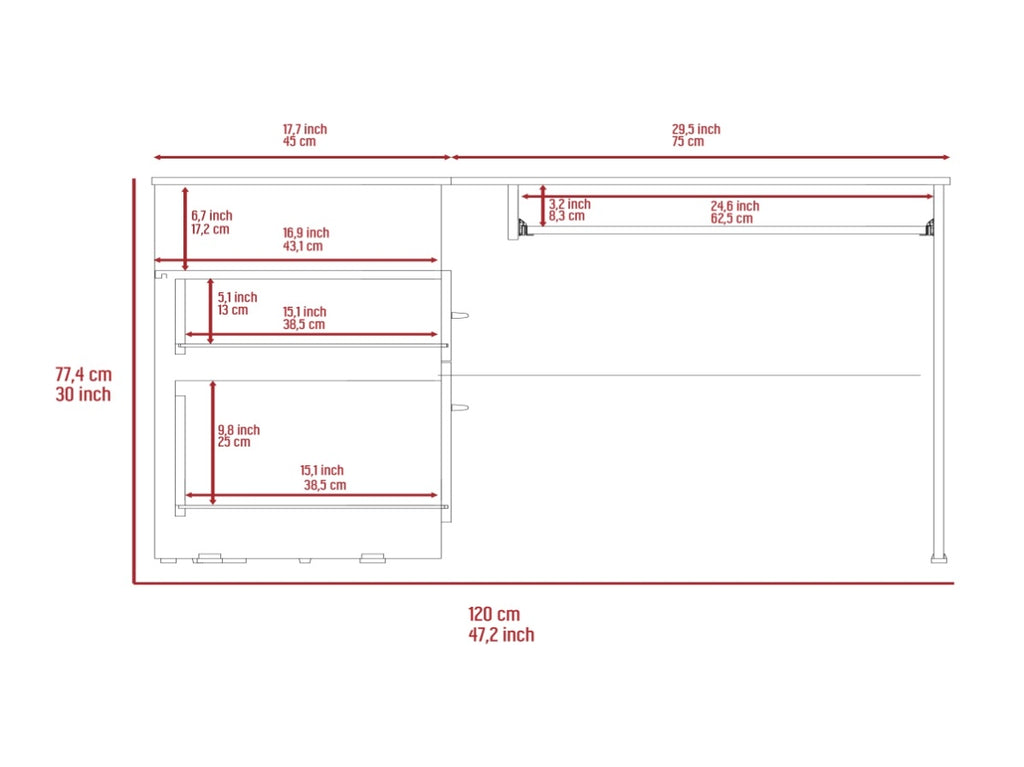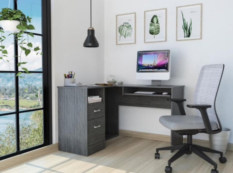 This L-shaped desk offers ample workspace and versatility, with two drawers for convenient storage of clothing, accessories, or personal items, and a single shelf for additional storage or display. The smokey oak finish adds a sophisticated, muted tone with subtle grain details, enhancing the elegance of your space and complementing various interior styles.