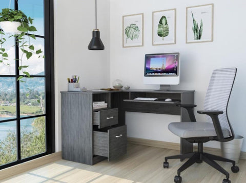 This desk features an L-shaped design, providing ample workspace and versatility.