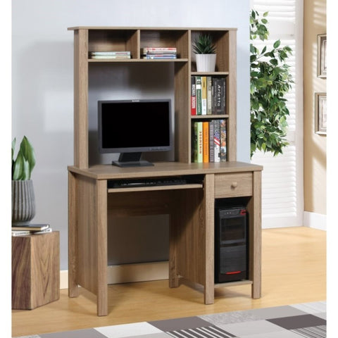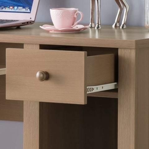This compact desk provides table top space, keyboard drawer, catch all drawer and shelf all in one. The keyboard drawer glides smoothly on pre-assembled metal 3/4 extension drawer glides. The catch all drawer glides smoothly on pre-assembled metal 3/4 extension drawer glides. Accented with a wooden knob handle, a stabilizing wooden back panel keep the desk sturdy for use for years to come.