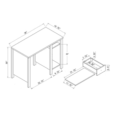 This compact desk provides table top space, keyboard drawer, catch all drawer and shelf all in one. The keyboard drawer glides smoothly on pre-assembled metal 3/4 extension drawer glides. The catch all drawer glides smoothly on pre-assembled metal 3/4 extension drawer glides. Accented with a wooden knob handle, a stabilizing wooden back panel keep the desk sturdy for use for years to come.