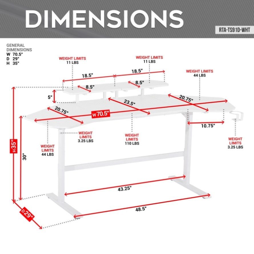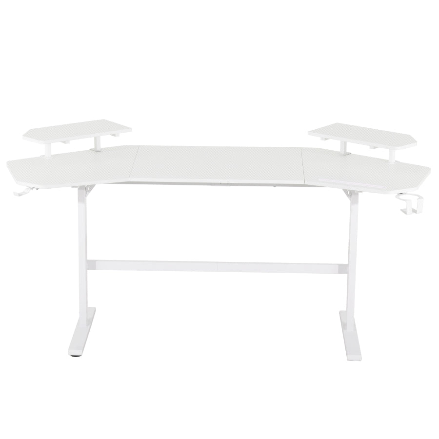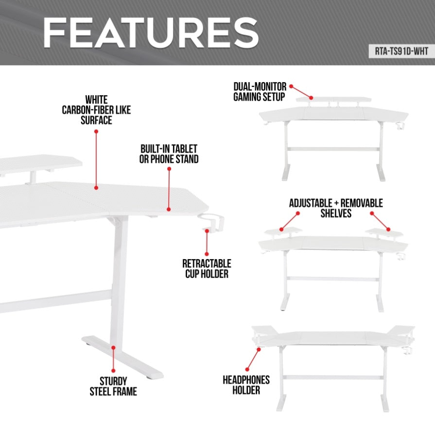 Experience unbeatable gaming sessions with the Techni Sport Defender Gaming Desk, designed for the serious gamer. Built with MDF in a stylish carbon fiber-like surface in black or white this desk offers a modern look that complements any gaming setup. Its sturdy steel frame is scratch-resistant, ensuring durability and a sleek appearance for years. With two adjustable and removable monitor shelves, it supports dual-monitor setups, enhancing your gaming experience. The desk also includes a retractable accessory holder and cup holder, and a tabletop built-in tablet or phone stand keeping your gaming essentials organized and within easy reach.