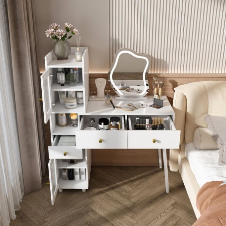 Spacious & Organized Vanity: Measuring 39.3"L x 15.75"W x 48.82"H, this dressing table delivers massive storage with 3 drawers, 2 open shelves, and 4 hidden cabinets (with transparent doors). Perfectly organizes cosmetics, haircare tools, and jewelry—finally banishing countertop clutter while keeping essentials within easy reach.